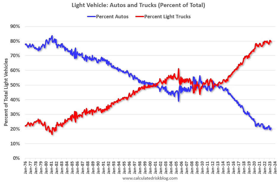 Como puedes ver, el predominio de los autos ha disminuido significativamente con el tiempo, mientras que los camiones ligeros y SUVs se han convertido en mayoría.