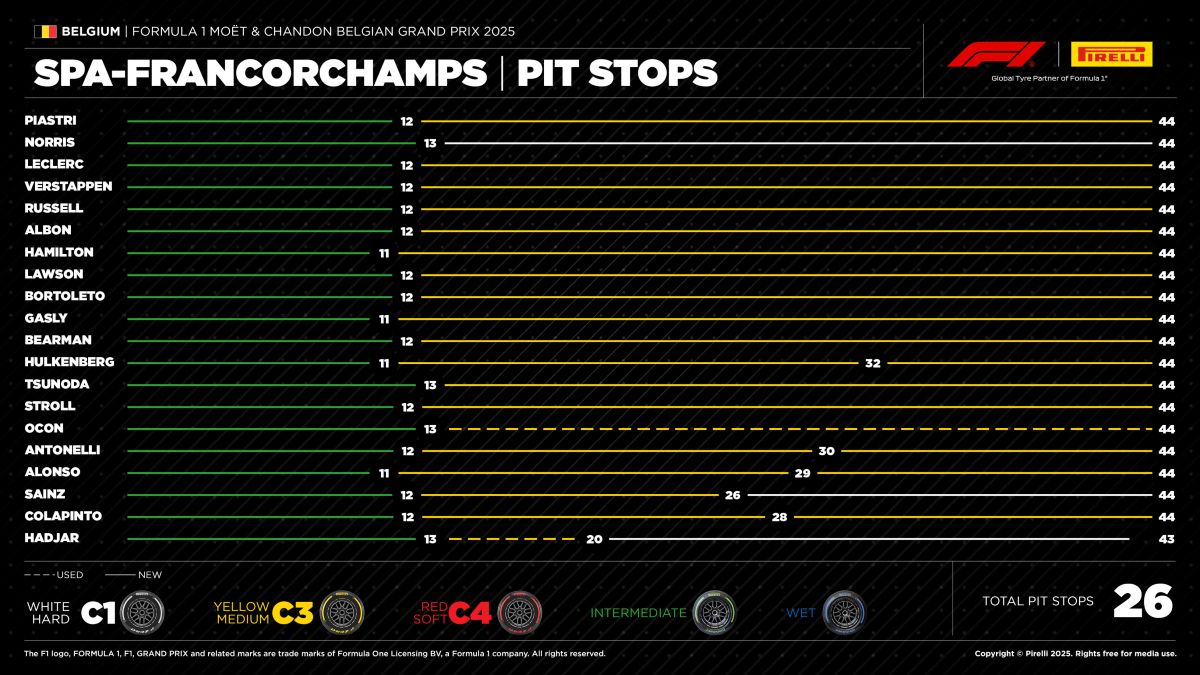 Seis pilotos —Andrea Kimi Antonelli, Fernando Alonso, Franco Colapinto, Isack Hadjar, Nico Hülkenberg y Carlos Sainz— han realizado una segunda parada. Los pilotos de Racing Bulls y Williams optaron por duros, mientras que los demás volvieron a montar medios.